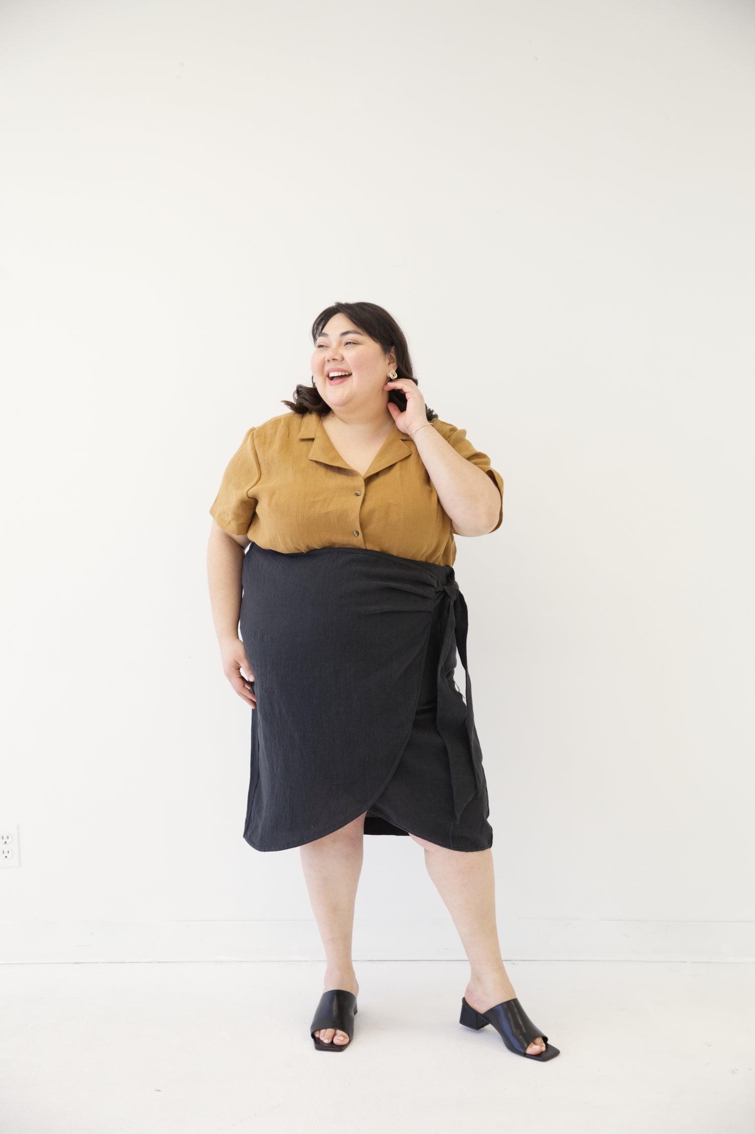 The I AM ABUNDANT Skirt is a faux wrap skirt featuring a waist tie, invisible side zipper & a comfy elastic waistband at the back. This effortless and elevated skirt easily dresses up any outfit.