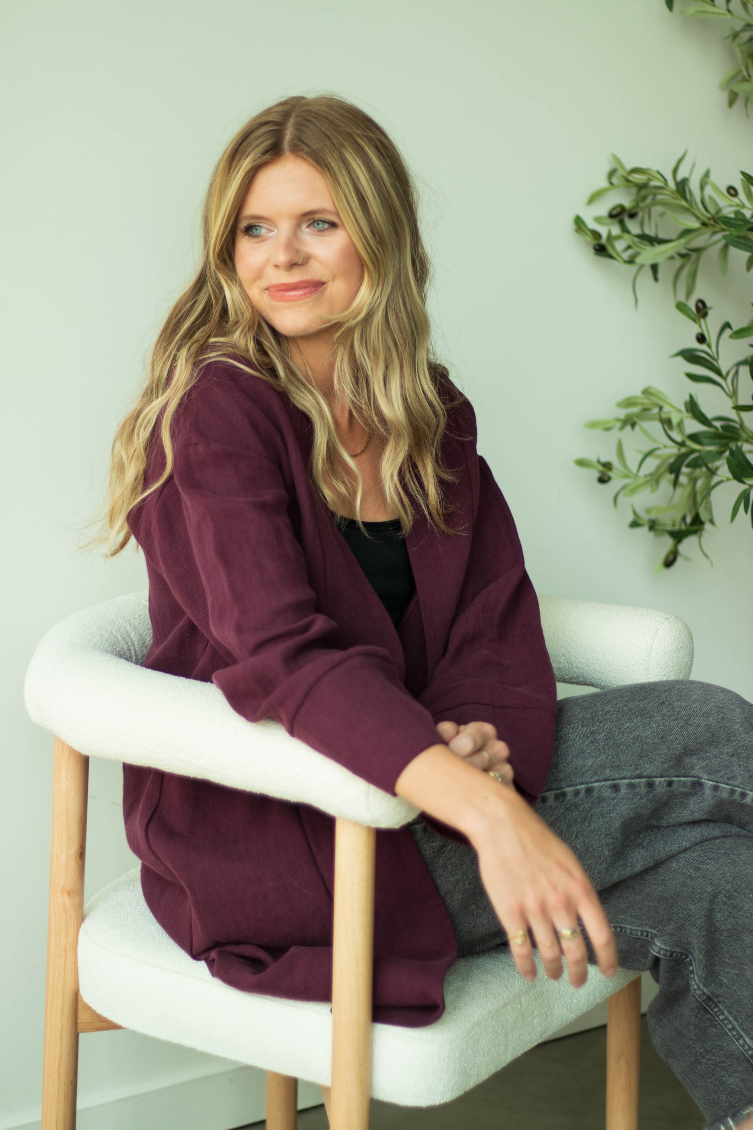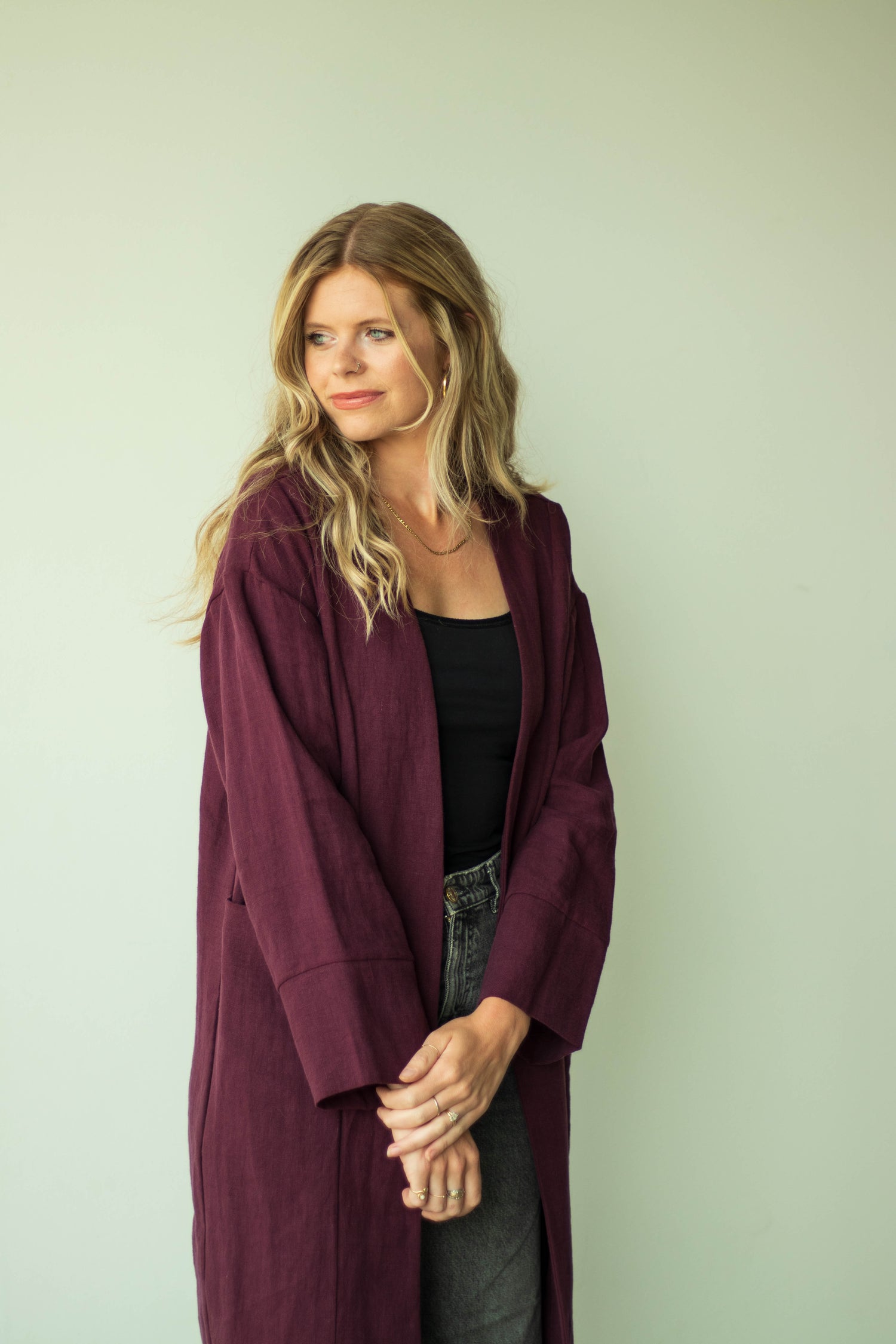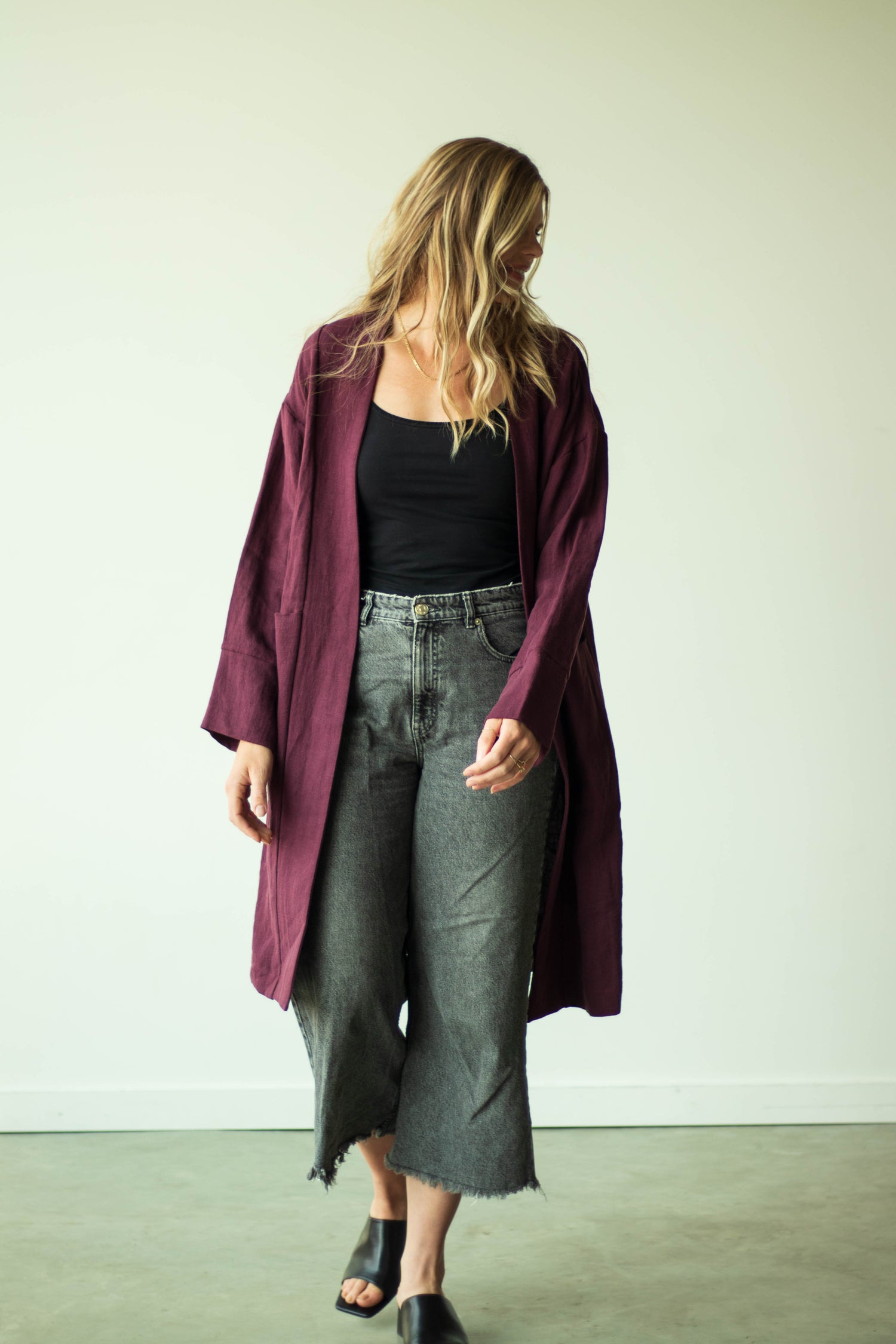 We removed the shawl collar, added cuffs to the sleeves for extra length and made the overall length longer. It comes in our heavyweight linen twill, ensuring it’ll be a comfy and warm transitional piece for many years to come.